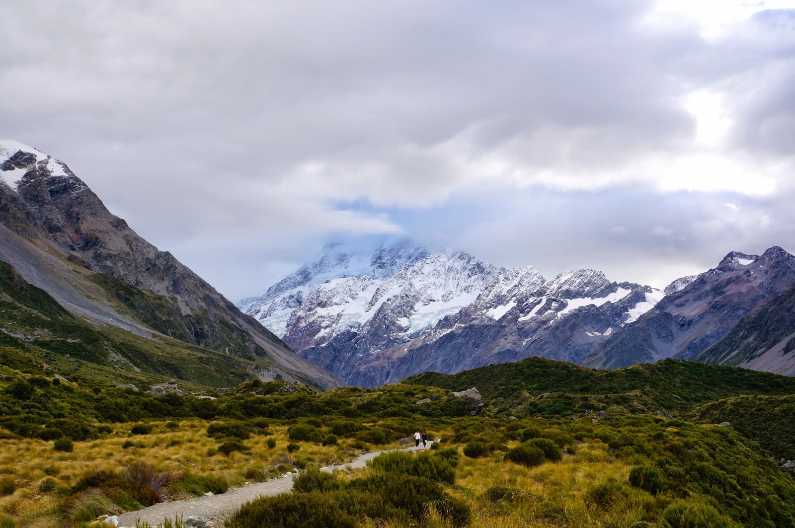 Hike with Mount Cook looming ahead |